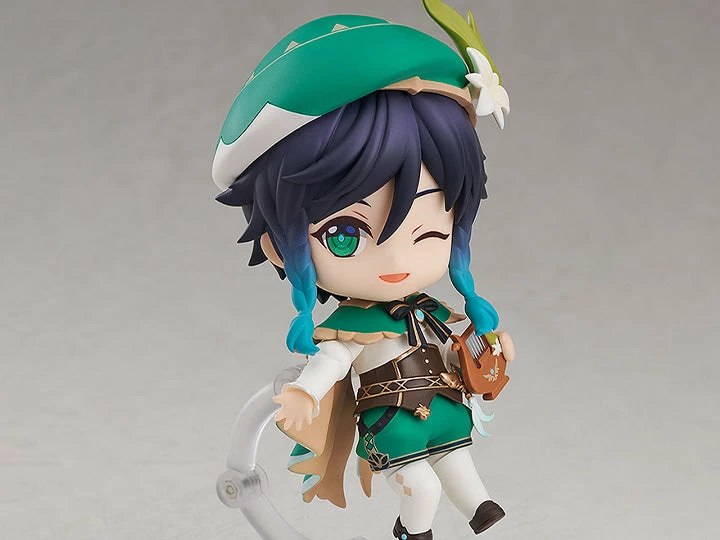 From the popular game Genshin Impact comes a Nendoroid of the Windborne Bard, Venti! He comes with three face plates including a winking face, a relaxed face with closed eyes, and a smiling face. He comes with his wooden lyre Der Frรผhling as well as the Skyward Harp bow, allowing you to recreate the battle scenes from the game.