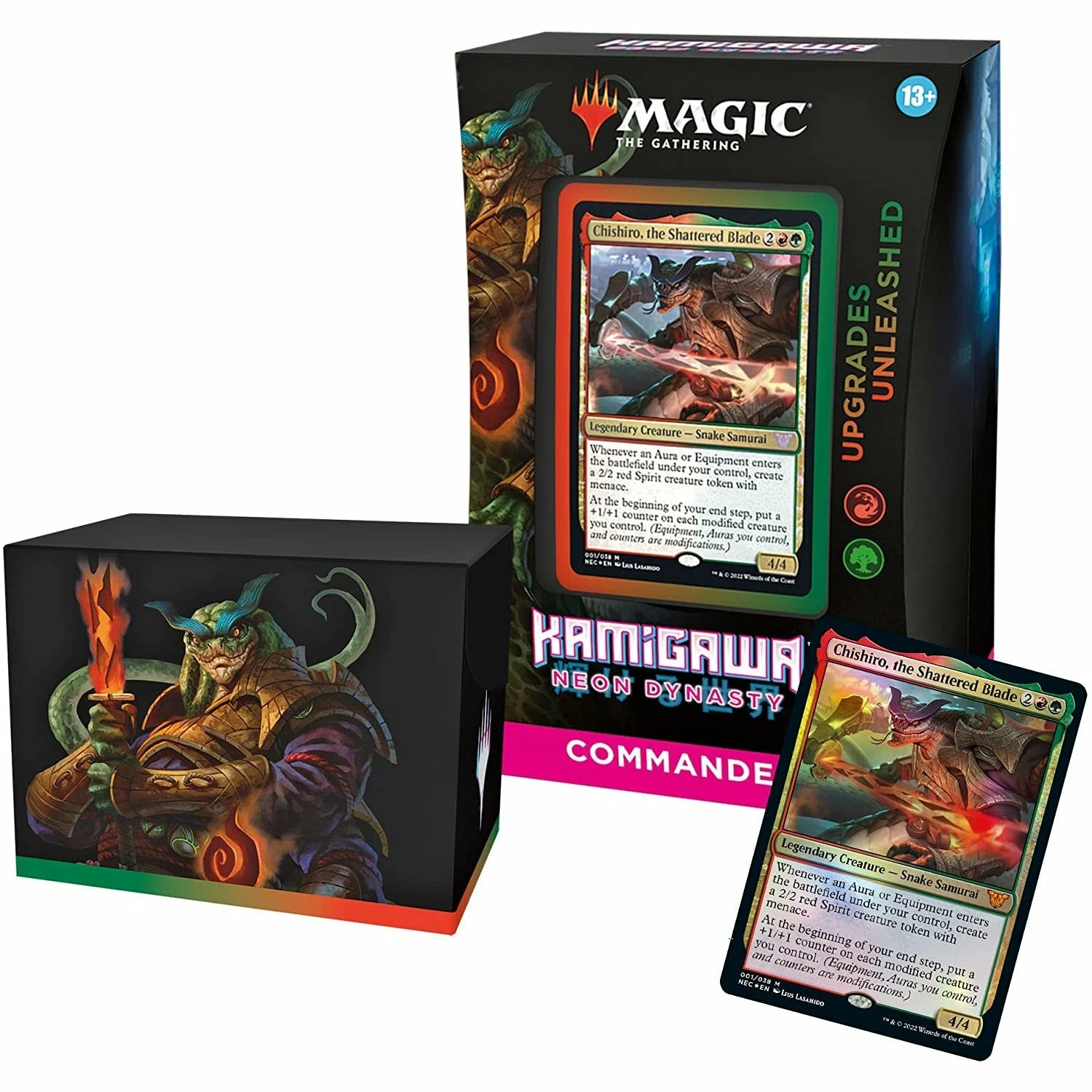 The Upgrades Unleashed Kamigawa: Neon Dynasty Commander Deck set includes 1 ready-to-play deck of 100 Magic cards (2 traditional foil, 98 nonfoil), 1 foil-etched Display Commander (a thick cardstock copy of the commander card with textured foil etched into the cardβs border and art), 10 double-sided tokens, 1 deck box (can hold 100 sleeved cards), 1 life tracker, and 1 reference card. Choose the Red-Green deck and hone your strength with Chishiro, the Shattered Blade. Chishiro likes to modify your creatures with Auras, Equipment, and +1/+1 counters to make them stronger. Equip your weapons, enchant your armies, and grow your creatures to defeat your opponents with epically enhanced abilities!