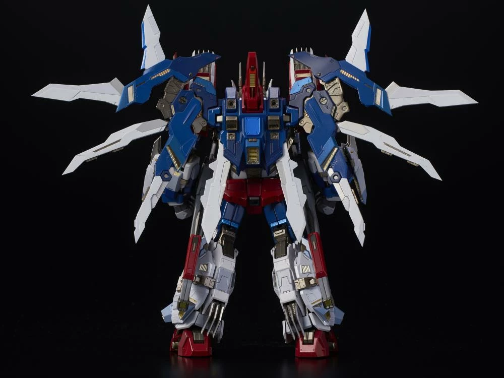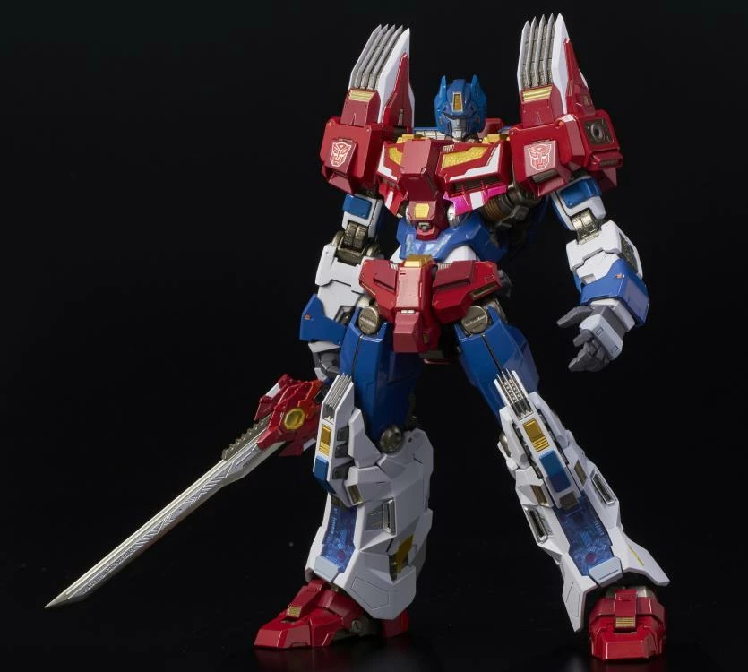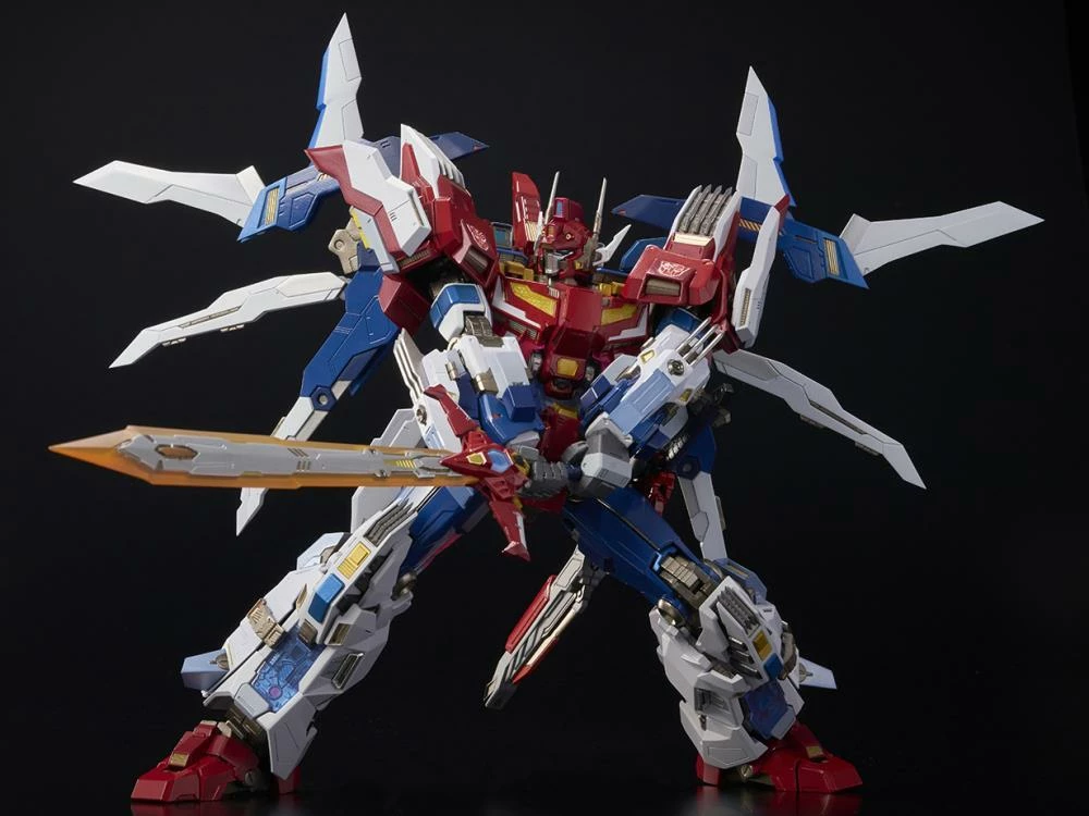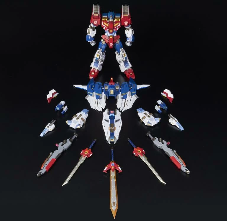 From Flame Toys, Star Saber is the fourth figure in theย Kuro Kara Kuri line. This non-transforming figure is based the characterโs design as seen in the comics. Star Saberย features a detachable face mask as well as diecast parts for solidity and heaviness. Weapon accessories include 2 small swords, a big sword, shield, and 2 small busters can be combined to be a big buster!