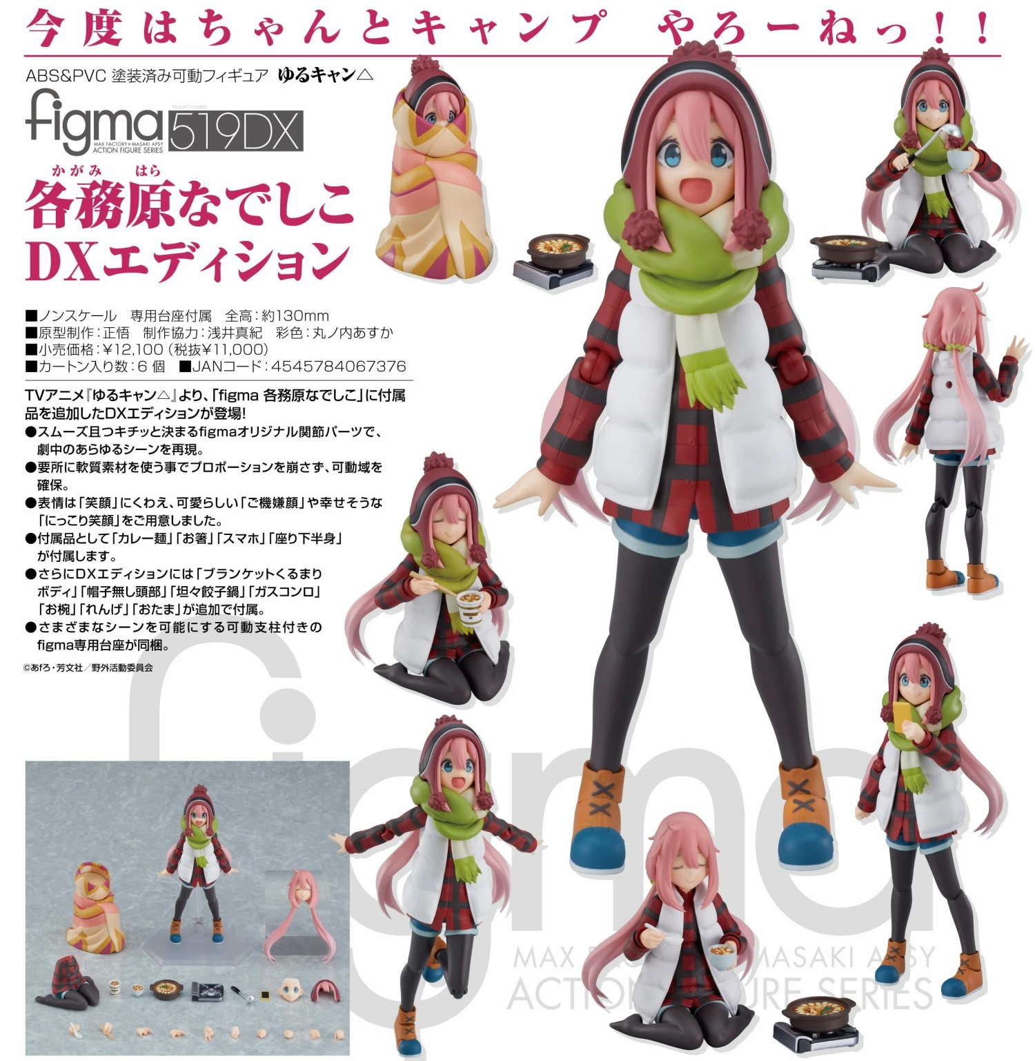 From the anime series Laid-Back Camp comes a figma of the main character Nadeshiko Kagamihara! This DX edition includes a variety of extra accessories like and additional lower-body part so she can sit wrapped in a blanket. Plus with items like a gyoza hot pot and stove you can recreate endless adorable scenes.