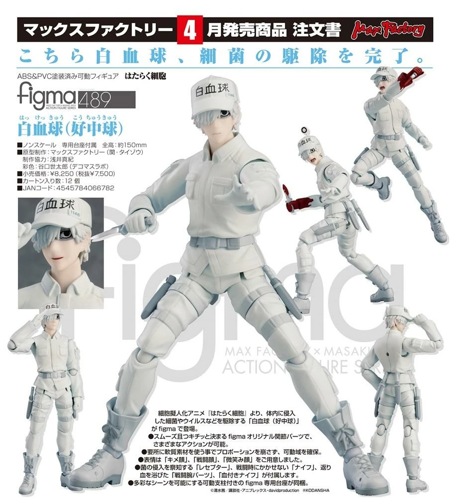 From the anime series Cells at Work! comes a figma of the cell that kills foreign bacteria and viruses in the body – the White Blood Cell (Neutrophil)!ย Using the smooth yet posable joints of figma, you can act out a variety of different poses.ย His receptor for locating unwanted bacteria, knife for combating viruses, interchangeable blood-stained arm parts and a blood-stained knife are all included.